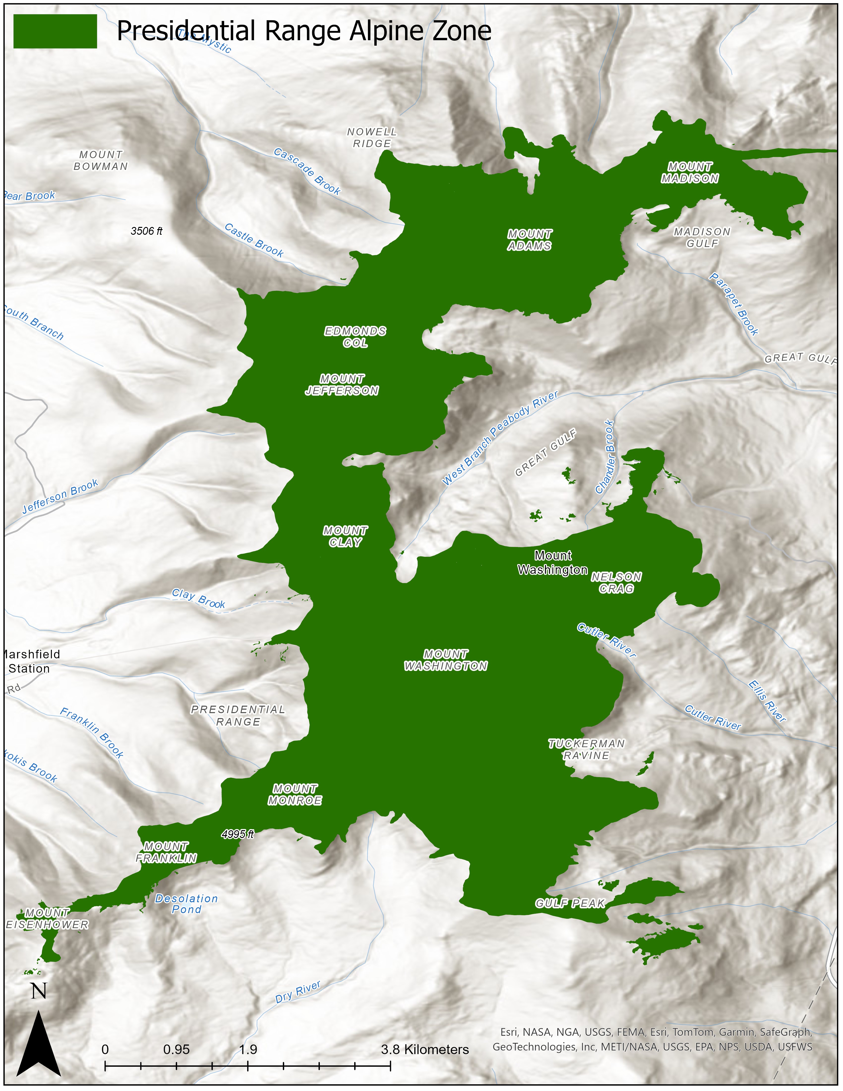 The project area includes the entire alpine zone of the Presidential Range in the White Mountains of New Hampshire (2792 acres) within the White Mountain National Forest. Mt. Washington is the most notable peak in this region with a summit elevation of 6,288 feet. The area is home to a number of alpine plant communities, which are distinct from the surrounding forests at lower elevations as a result of the harsh climate. Notable species include Diapensia, Bigelow sedge, a number of uncommon Vaccinium species, and other ericaceous plants. The Alpine Gardens, a 100-acre area to the east of the Mt. Washington summit, is an area of special consideration, as it serves as an ecological refugia that hosts a large diversity of native plants.