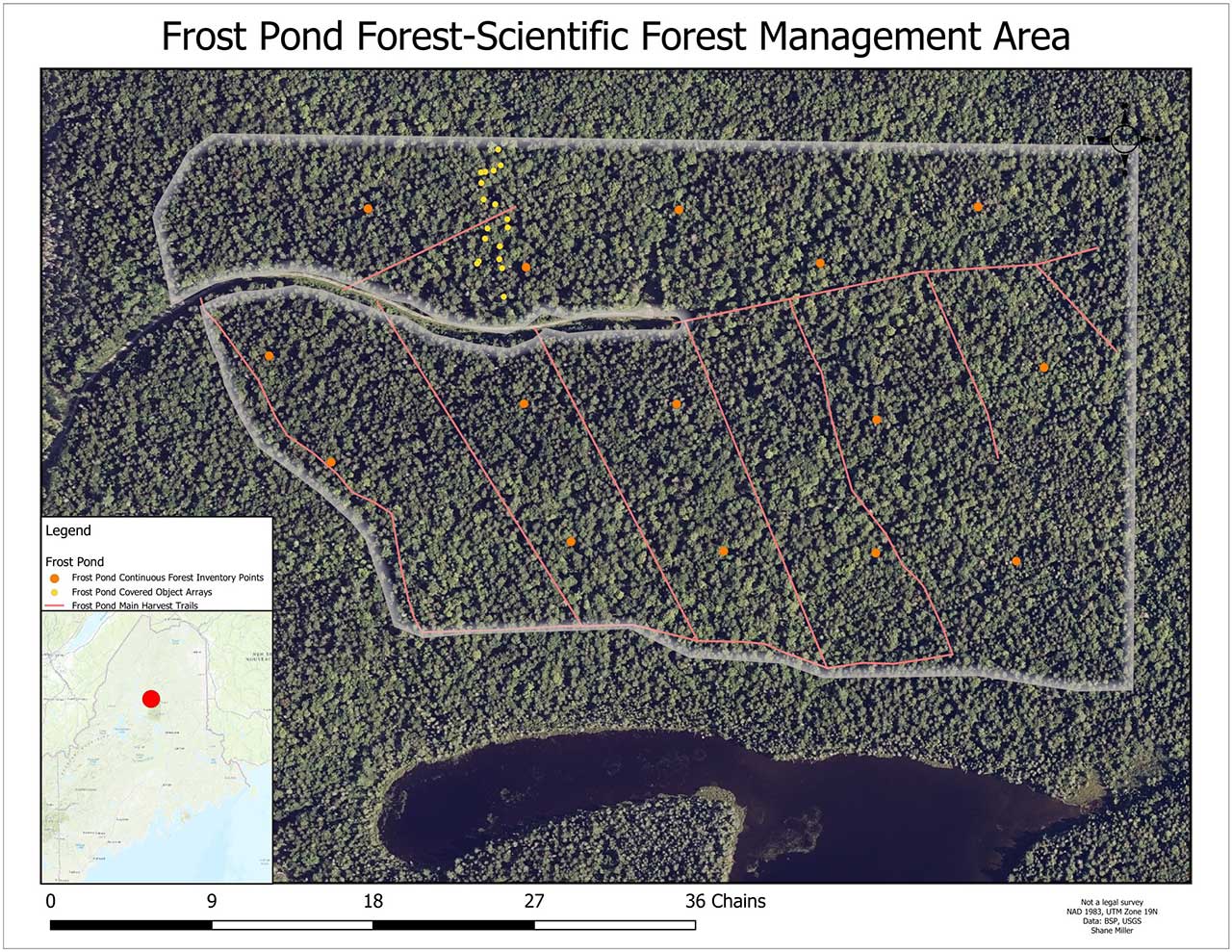 Baxter State Park, is a 209,644-acre wilderness area in northern Maine. The Park is one of the most intact wilderness landscapes in the eastern United States, forming a core ecological reserve in a mosaic of conservation lands spanning northern New England. The park contains Maine’s largest concentration of rare plants, as well as critical habitat for rare, threatened, and endangered animal species. Baxter State Park and Maine’s western mountains contain most of the natural communities considered highly vulnerable to climate change in Maine, including snowmelt-dominated headwater streams, alpine tundra, peatlands, and high-elevation forests. This region lies at the heart of the largest, most intact temperate forest in North America, and forms a critical linkage between temperate biomes to the south and the vast boreal forests to the north.Frost Pond Forest is an approximately 150-acre stand within Baxter State Park's Scientific Forest Management Area (SFMA).The most recent harvest in this area was in the early 2000s in response to a spruce bark beetle outbreak; a sanitation harvest was conducted to remove dead and dying trees that were susceptible to spruce bark beetle and to prevent the infestation of nearby trees. (More information about this past harvest prescription can be found at the Northeast Silviculture Library link below.)